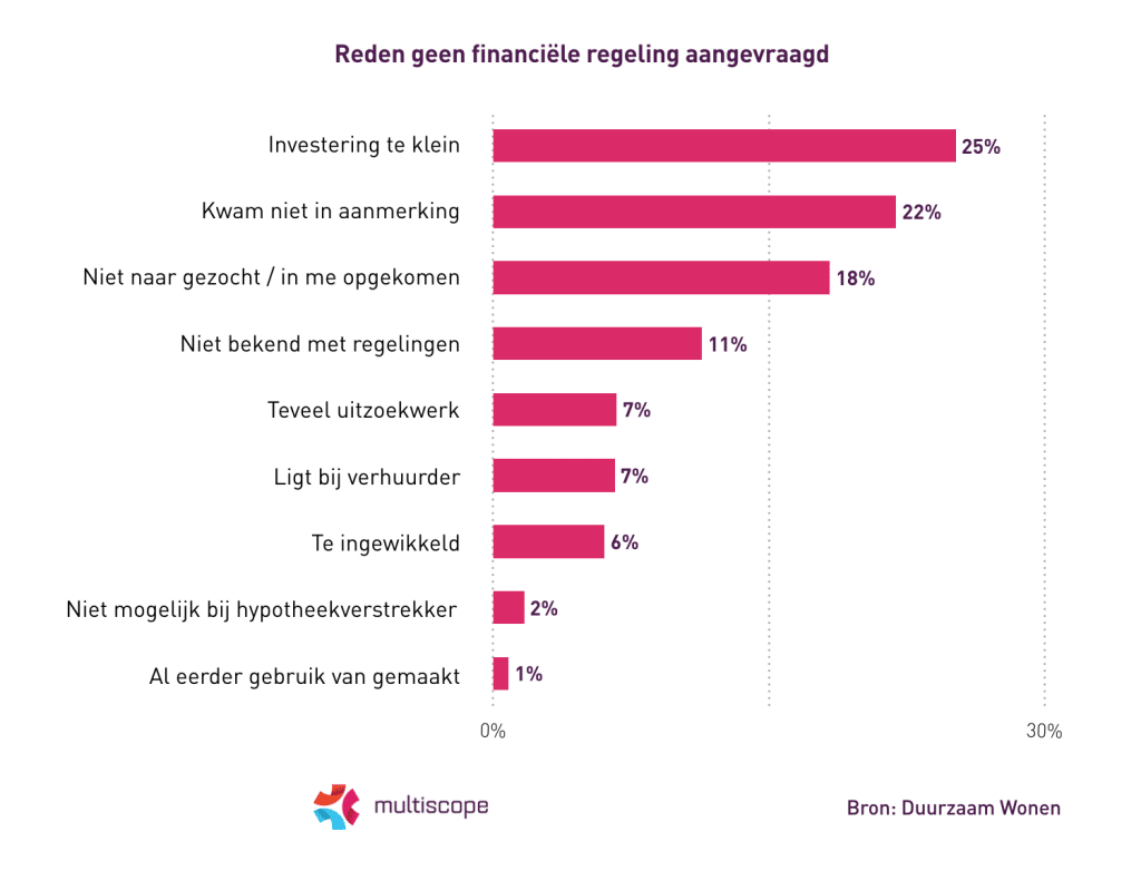In de meeste gevallen is het investeringsbedrag te laag (25%) of komt men niet in aanmerking voor ondersteuning (22%), zo blijkt uit het onderzoek van Multiscope. Voor zo’n 42% speelt onbekendheid met financiële regelingen een rol. Zo komt het bij 18% niet op om te zoeken naar mogelijkheden en is 11% hier niet mee bekend. 7% vindt het te veel uitzoekwerk en 6% vindt de financiële regelingen te ingewikkeld.