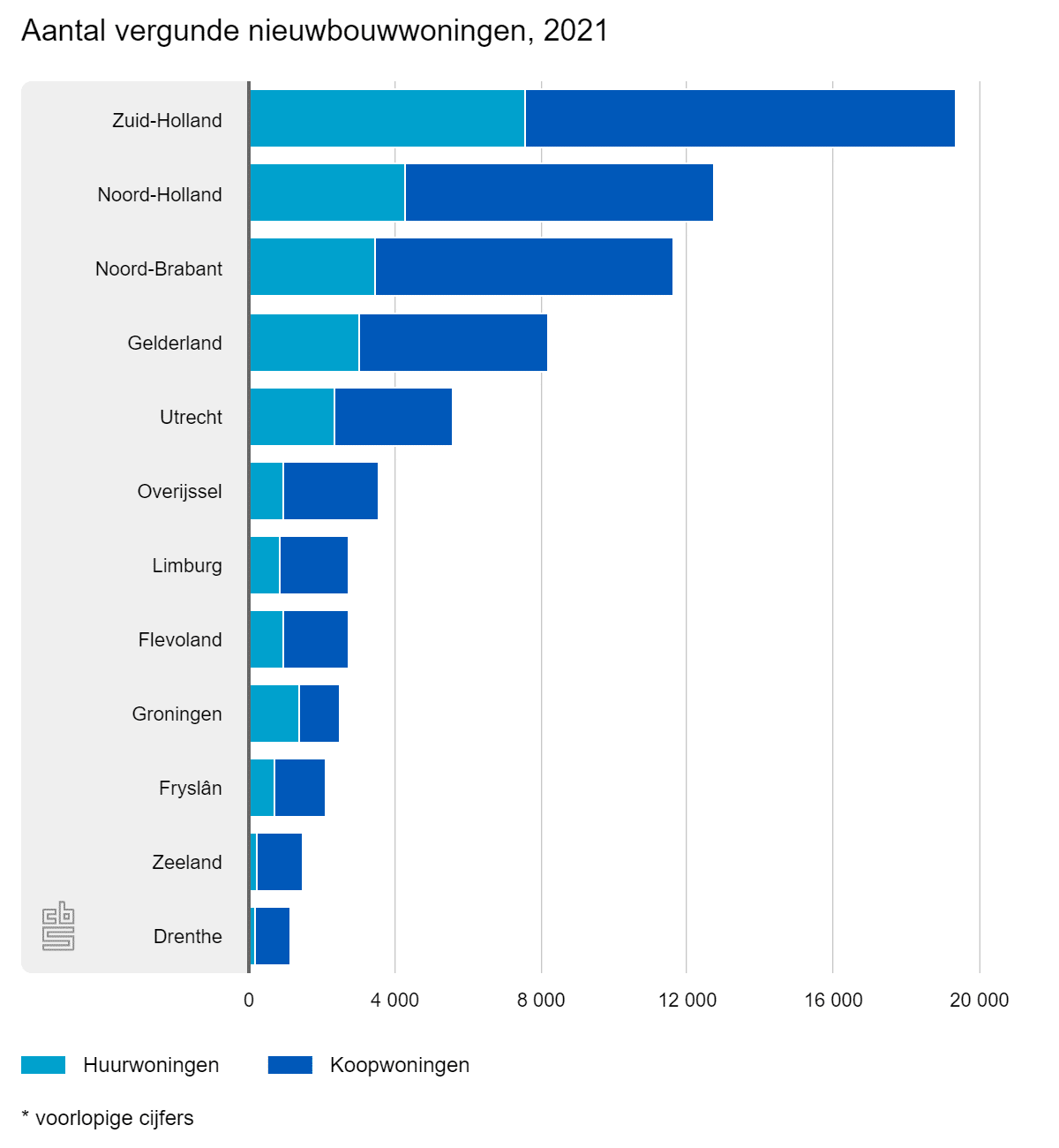 In Zuid-Holland werden in 2021 met ruim 19.000 de meeste nieuwbouwwoningen vergund. 39% daarvan is bestemd voor verhuur. In Drenthe werden, met bijna 1.200 nieuwe woningen, de minste nieuwbouwvergunningen verleend, waarvan 17% bestemd voor verhuur. Dat is het laagste aandeel huurwoningen van alle provincies. Ook in Zeeland werden relatief veel meer vergunningen verleend voor koop- dan voor huurwoningen. Daar was 82% van de bijna 1.500 vergunde nieuwbouwwoningen bestemd voor de verkoop.