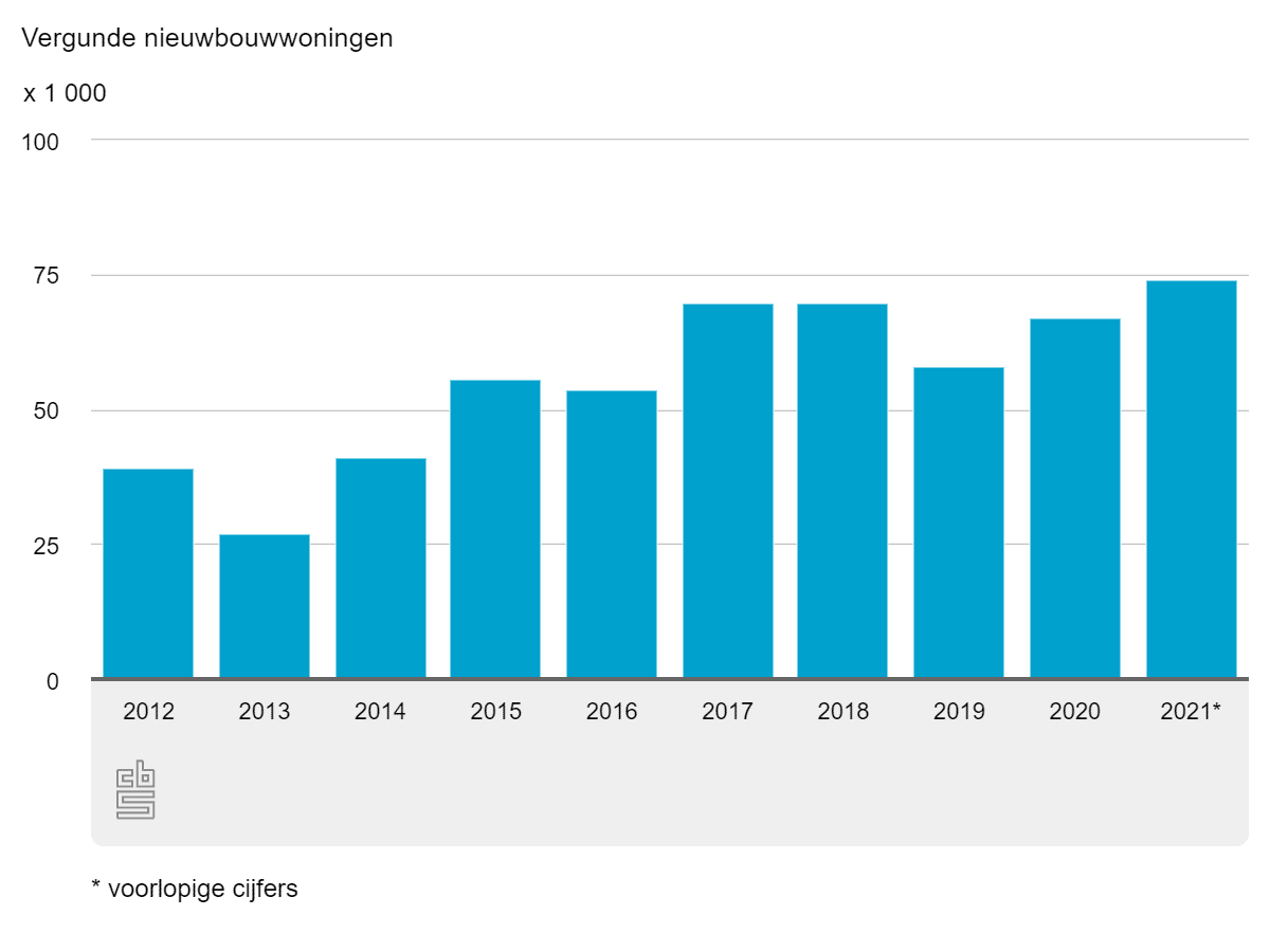 In 2021 werd voor 74.000 nieuw te bouwen woningen een vergunning afgegeven. Dat is 10% meer dan in 2020 en het hoogste aantal nieuwbouwvergunningen in meer dan tien jaar.