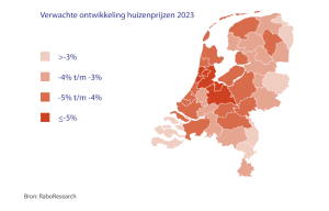 De Rabobank gaat uit van een daling van de huizenprijzen van 7,5% voor 2023. Volgend jaar zal dat ongeveer 1,5% zijn. De bank verwacht daarmee dat de prijzen gaan stabiliseren. ABN Amro rekent op een prijscorrectie van 10,5% voor woningen in 2023 en voor volgend jaar een daling van de huizenprijzen met 3%.