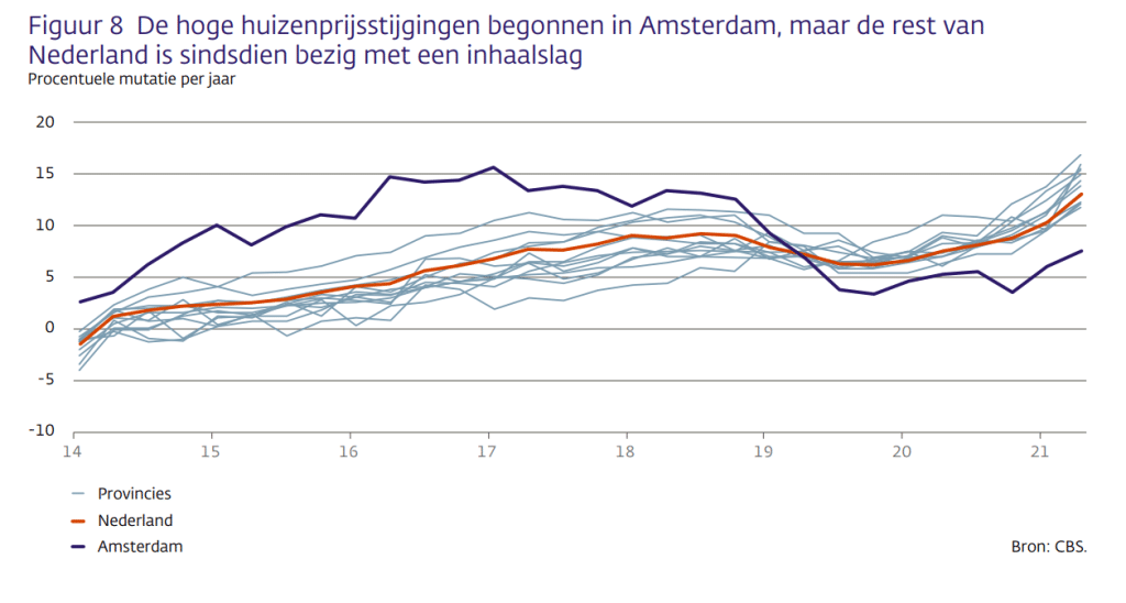 DNB wijst onder meer op de risico’s van de huidige woningmarkt. “De uitbundige huizenprijsstijging hangt veeleer samen met de leenruimte die Nederlandse huishoudens hebben. Er is simpelweg te veel geld op zoek naar te weinig woningen. Kopers gaan steeds verder om het winnende bod uit te brengen en vertonen daarbij steeds risicovoller leengedrag”, aldus Knot.