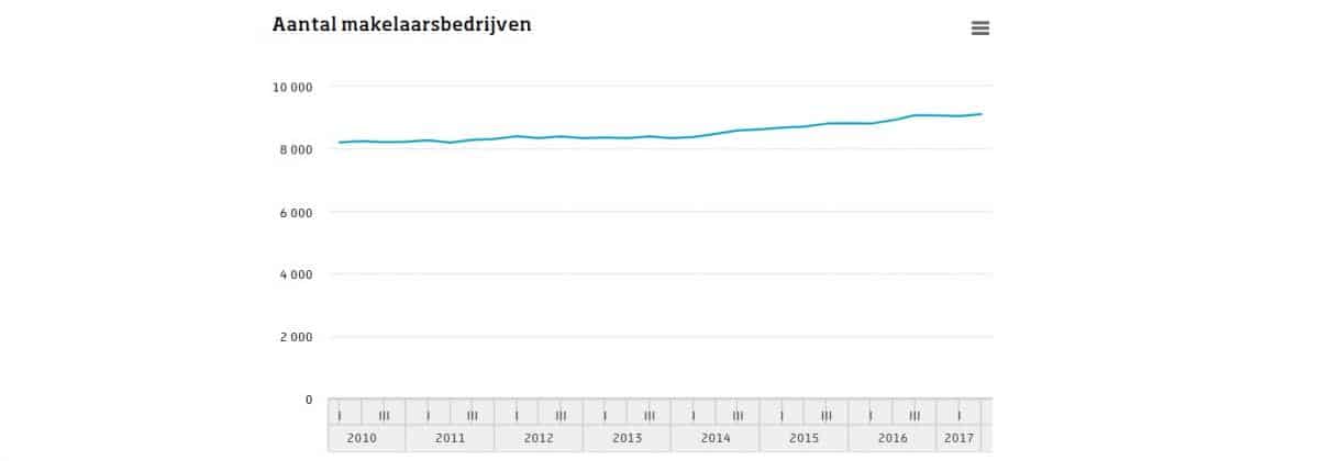 Het aantal makelaarsbedrijven is sinds 2010 met ruim 10 procent toegenomen. De ruim 9 duizend makelaars die Nederland begin 2017 telde, is het hoogste aantal in zeven jaar tijd.