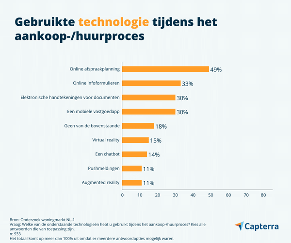 Daarnaast wordt er gebruikgemaakt van andere technologieën. 49% van alle respondenten in het onderzoek maakte op enig moment tijdens het huur- of koopproces gebruik van een online afsprakensysteem. 33% maakte gebruik van online informatieformulieren. 30% gebruikte elektronische handtekeningen voor het tekenen van documenten gerelateerd aan de huur of koop van het huis en 30% gebruikte een mobiele app.