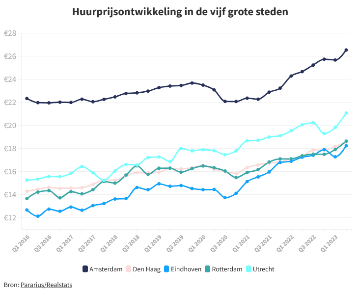 De gemiddelde vierkantemeterprijs steeg in deze steden – Amsterdam, Den Haag, Eindhoven, Rotterdam en Utrecht – met 5 tot bijna 8%. Zo betaalden nieuwe huurders in Amsterdam 7,6% meer (€26,55) voor een vrijgekomen huurwoning in de vrije sector. Ook in Den Haag (€18,57) en Rotterdam (€18,64) ging de gemiddelde vierkantemeterprijs 7,3% omhoog. In Utrecht (€21,08) en Eindhoven (€18,24) steeg de vierkantemeterprijs met iets meer dan 5% ten opzichte van een jaar geleden: nieuwe huurders betaalden 5,1 en 5,8% meer.