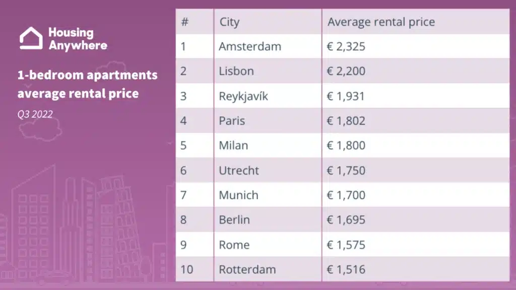 Amsterdam overtreft alle Europese steden op het gebied van huurprijzen. Zo neemt de hoofdstad een nummer één positie in Europa in als duurste stad voor het huren van een appartement (€2.325), studio (€ 1.998) en kamer (€ 845). Het afgelopen kwartaal stegen de appartementsprijzen in Amsterdam dan ook met 18,3%, de studioprijzen met 17,5% en de kamerprijzen met 5,6%. In Utrecht stegen de kamerprijzen het hardst met 16,5% naar € 699. Opvallend is dat in Utrecht als enige stad in Nederland de studioprijzen daalden met 1,7% naar € 1.1780 per maand.