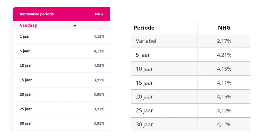 In de renteoverzichten van Lot Hypotheken, dochterlabel van NIBC (zie hieronder, linker tabel) en MUNT Hypotheken (rechter tabel) is te zien dat bij de NHG-tarieven van deze aanbieders inmiddels een bijzondere situatie is ontstaan. Normaal gesproken zijn de langlopende rentes hoger dan de kortlopende tarieven, maar hier is dat omgekeerd. Een inverse rentestructuur in vaktaal.