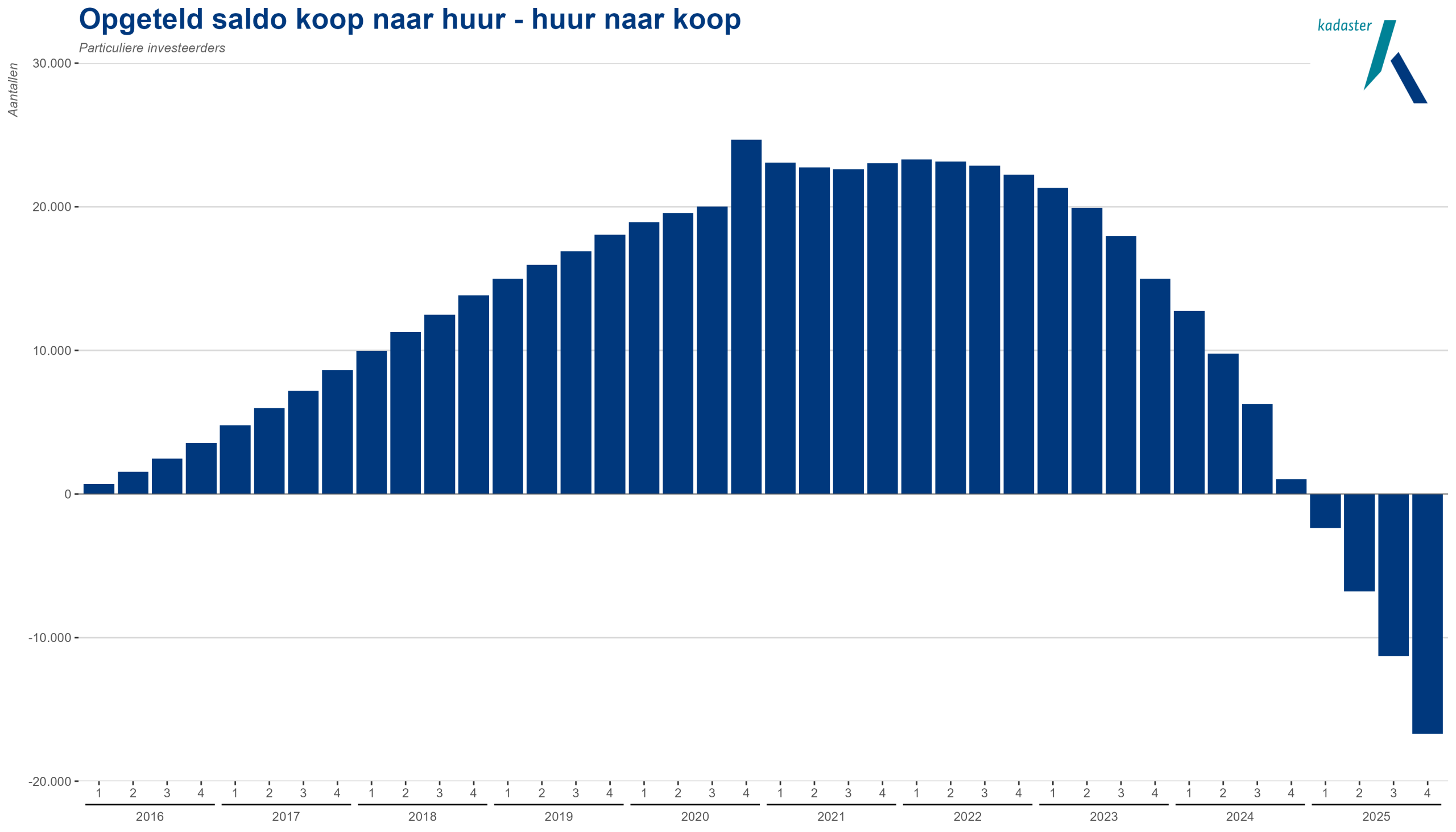 In het vierde kwartaal van 2025 was het verschil tussen aangekochte en verkochte woningen opgelopen tot bijna -17.000. Dit betekent dat particuliere investeerders bij elkaar opgeteld in de periode 2016-2025 meer woningen aan eigenaar‑bewoners hebben verkocht dan dat ze in die periode van hen kochten.