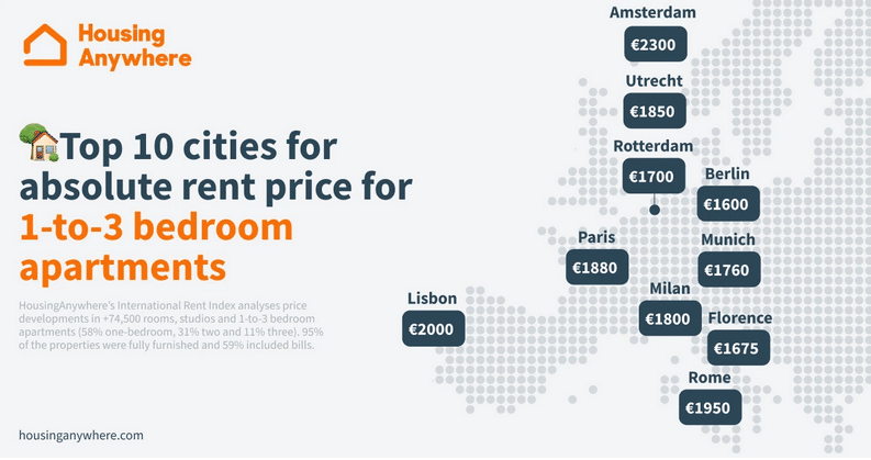 Voor deze (21e) kwartaaleditie van de Huurindex per Stad analyseerde HousingAnywhere 74.594 objecten die het afgelopen jaar op het platform werden aangeboden en interesse kregen van potentiële huurders. Het betreft eenpersoonskamers, studio’s en appartementen met één tot drie slaapkamers in 23 Europese steden. De aanbiedingen waren voornamelijk gericht op jonge professionals en studenten die naar het buitenland verhuisden.