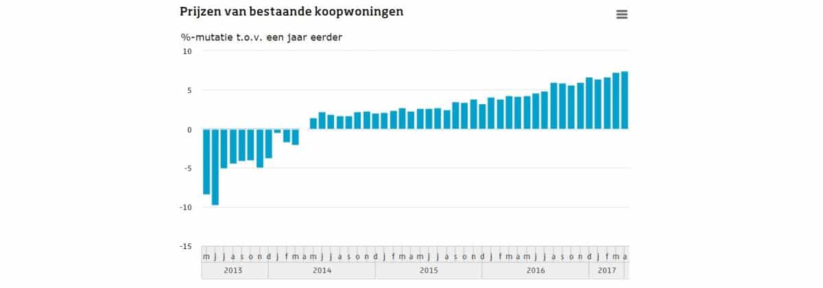 Bestaande koopwoningen waren in april 7,4 procent duurder dan in april 2016. Dat is de hoogste prijsstijging na maart 2002. Sinds juni 2013 is sprake van een stijgende trend van de huizenprijzen.