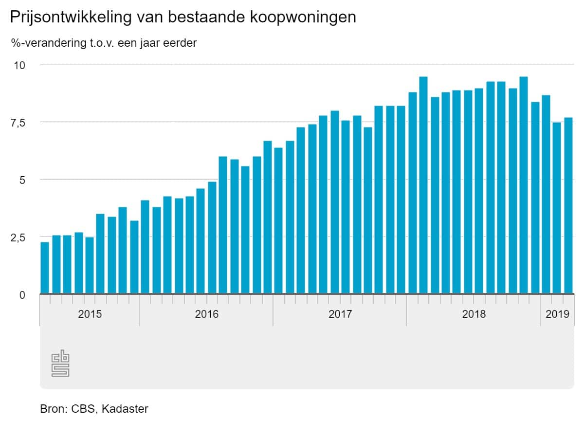 Na een piek in augustus 2008 daalden de prijzen van koopwoningen en in juni 2013 werd een dieptepunt bereikt. Sindsdien is sprake van een stijgende trend. In mei 2018 was de prijsindex bestaande koopwoningen voor het eerst hoger dan het recordniveau in augustus 2008. In maart 2019 bereikte de index het hoogste niveau ooit. Vergeleken met het dal in juni 2013 lagen de prijzen in maart 36,1 procent hoger.