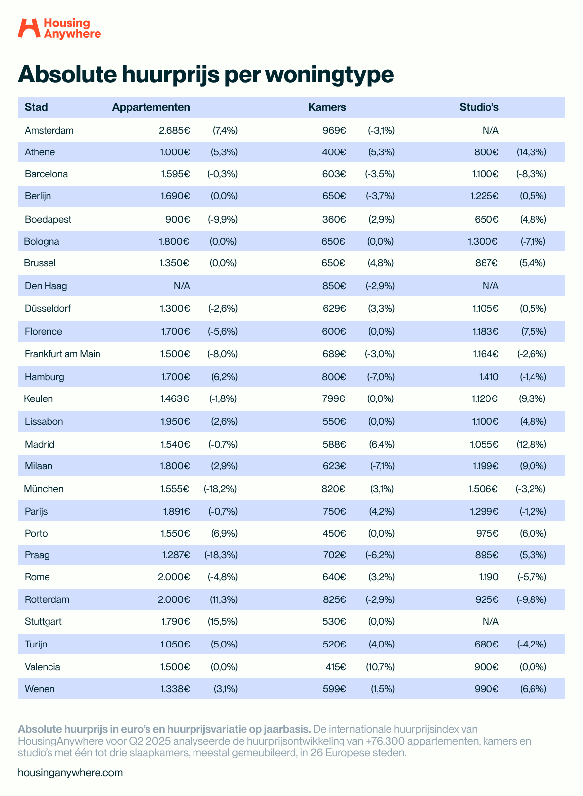 De huurprijzen voor kamers in Europa stegen licht met 0,4%, maar in Nederlandse studentensteden is juist een daling zichtbaar. In Amsterdam (-3,1%), Rotterdam (-2,9%) en Den Haag (-2,9%) gingen de prijzen omlaag. Toch blijven de huurprijzen hoog: voor een gemeubileerde kamer betaal je gemiddeld €969 in Amsterdam, €850 in Den Haag en €825 in Rotterdam.