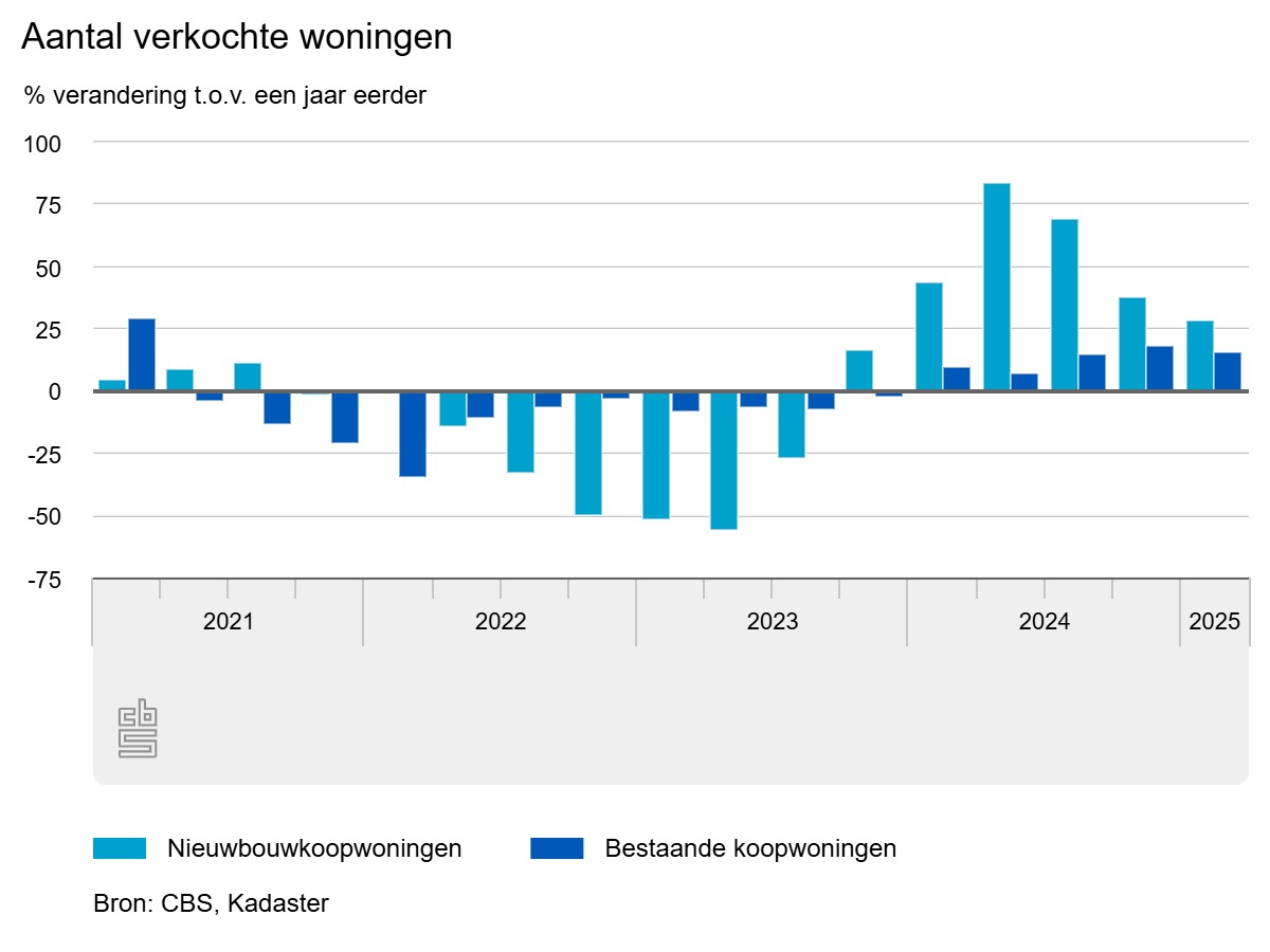 Er werden volgens het CBS ook meer bestaande koopwoningen verkocht, bijna 16% meer dan in het eerste kwartaal van 2024. In totaal werden er in het eerste kwartaal van 2025 51.500 bestaande koopwoningen verkocht.