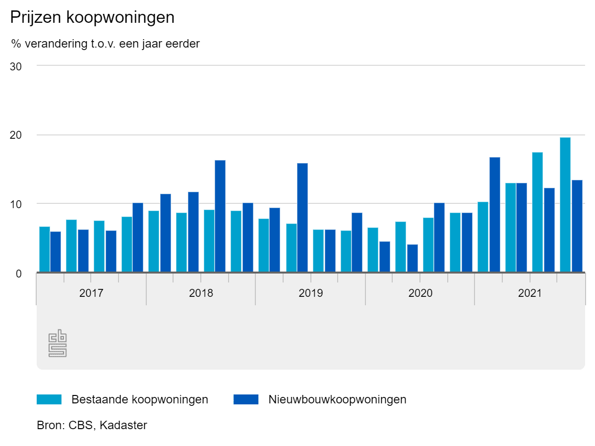 Dat blijkt uit nieuwe cijfers van het CBS, het Kadaster en Eurostat. De huizenprijsindex, waarin de transactieprijzen van zowel nieuwbouw- als bestaande koopwoningen worden meegenomen, was in het vierde kwartaal van 2021 bijna 19% hoger dan een jaar eerder.