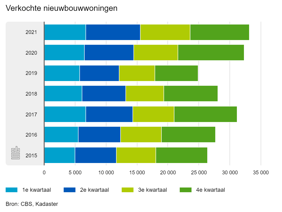 Ondanks een afname in het vierde kwartaal, zijn er in 2021 meer nieuwbouwwoningen verkocht dan in 2020. In heel 2021 werden 33.204 nieuwbouwwoningen verkocht. Dat is het hoogste aantal sinds het begin van de meting in 2015.