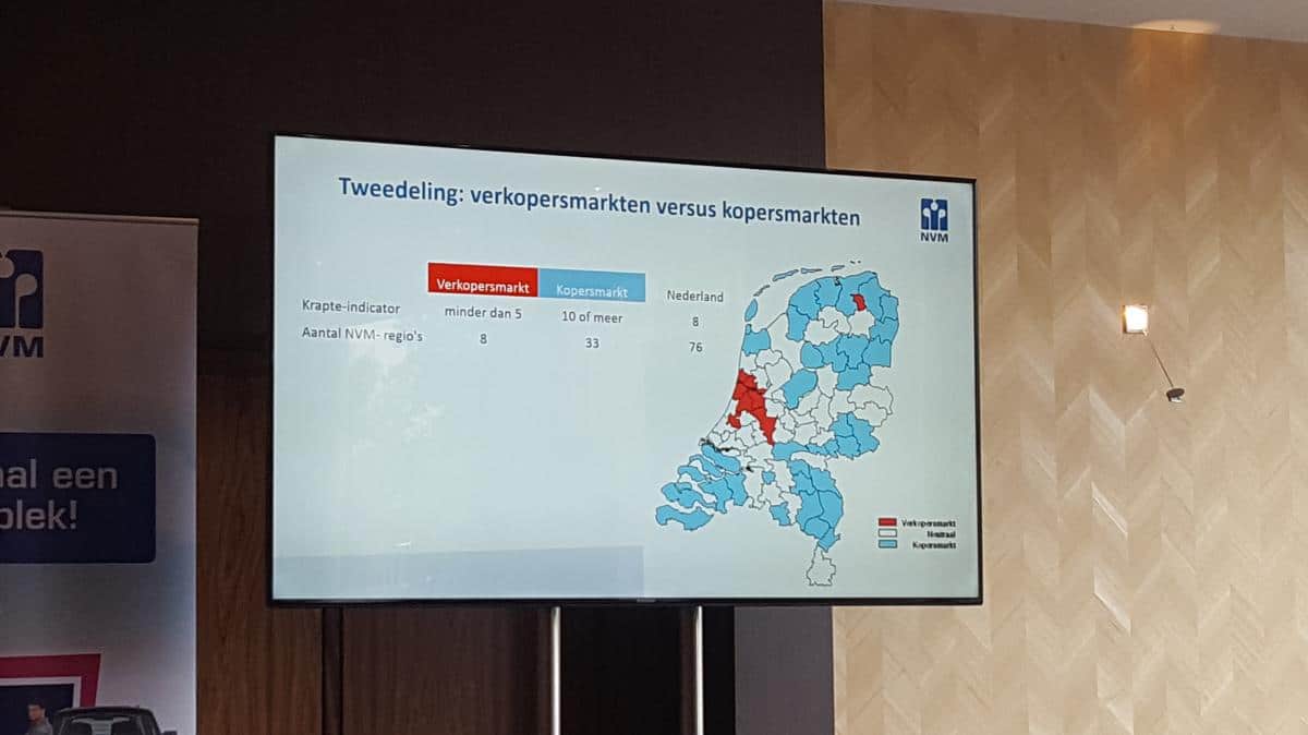 Het algehele record uit 2006 is dit kwartaal gebroken: er wisselden bijna 43.000 woningen uit het NVM-bestand van eigenaar. Ook de prijzen zetten hun stijgende lijn voort: landelijk met 5,6% ten opzichte van hetzelfde kwartaal 2015. Maar het gros van de verkopers komt bedrogen uit als zij daarom denken weer het volle pond voor hun woning te kunnen krijgen. Want in slechts 8 regio’s heerst een verkopersmarkt. In de overige 33 NVM-regio’s heeft de koper het nog steeds voor het uitkiezen. De NVM maakt zich zorgen over de groeiende kloof tussen de kopers- en verkopersmarkten. (zied afbeelding)