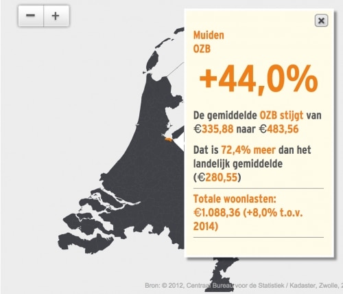 Bij koploper Muiden is de situatie bijzonder: deze artikel 12 gemeente staat onder curatele van de provincie Noord Holland en heeft de OZB sterk verhoogd, terwijl de afvalstoffenheffing tegelijkertijd fors is verlaagd. Per saldo betalen huiseigenaren in deze gemeente gemiddeld ruim 80 euro meer (+8%) ten opzichte van 2014. Ook de gemeente Veendam verhoogt de ozb met +33% sterk. De gemiddelde ozb-aanslag stijgt daar van 204 naar 272 euro, waardoor een gemiddelde huiseigenaar dit jaar 68 euro meer betaalt.