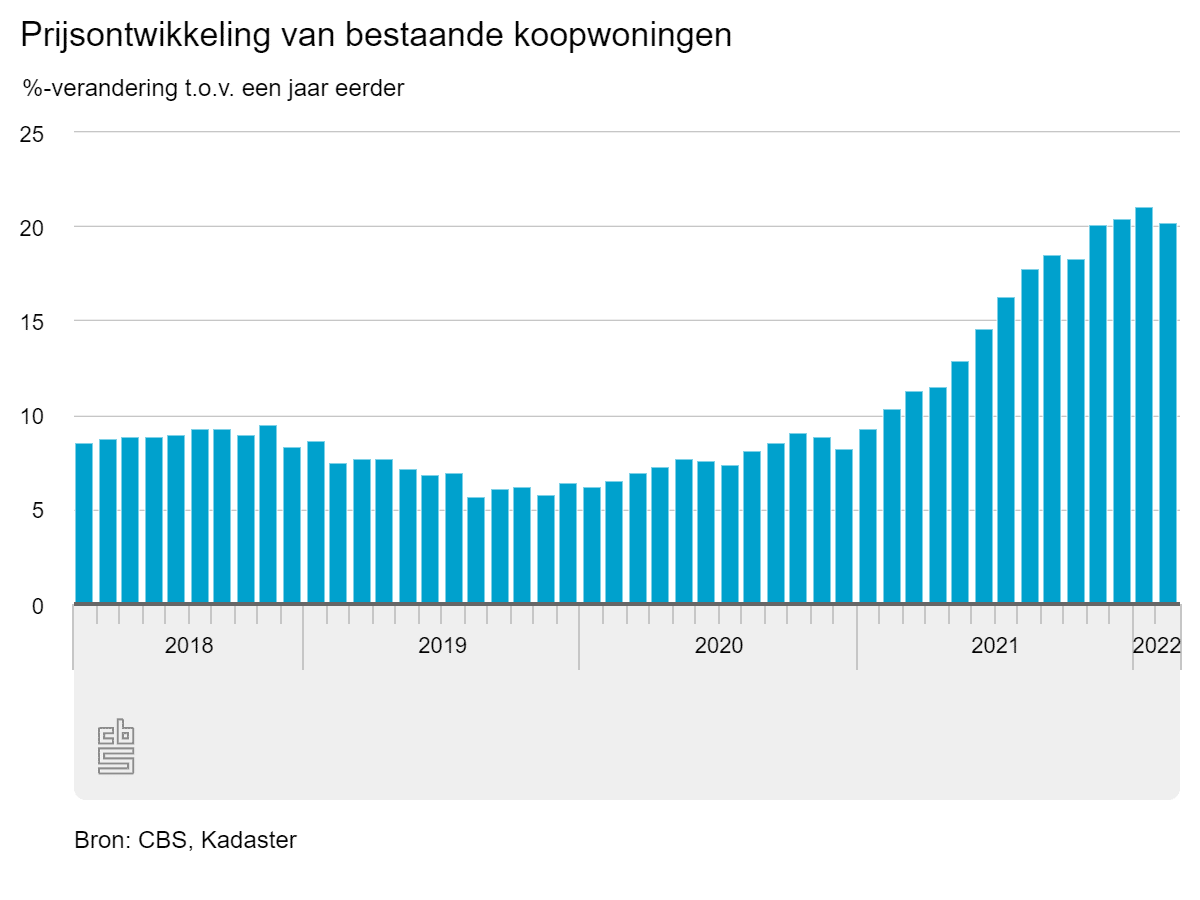 Dat blijkt uit onderzoek naar de prijsontwikkeling van bestaande particuliere koopwoningen in Nederland van het CBS en het Kadaster. De prijsstijging is wat kleiner dan een maand eerder, toen met 21,1% de grootste prijsstijging sinds 1995 werd genoteerd. In dat jaar begon het CBS de cijfers bij te houden.