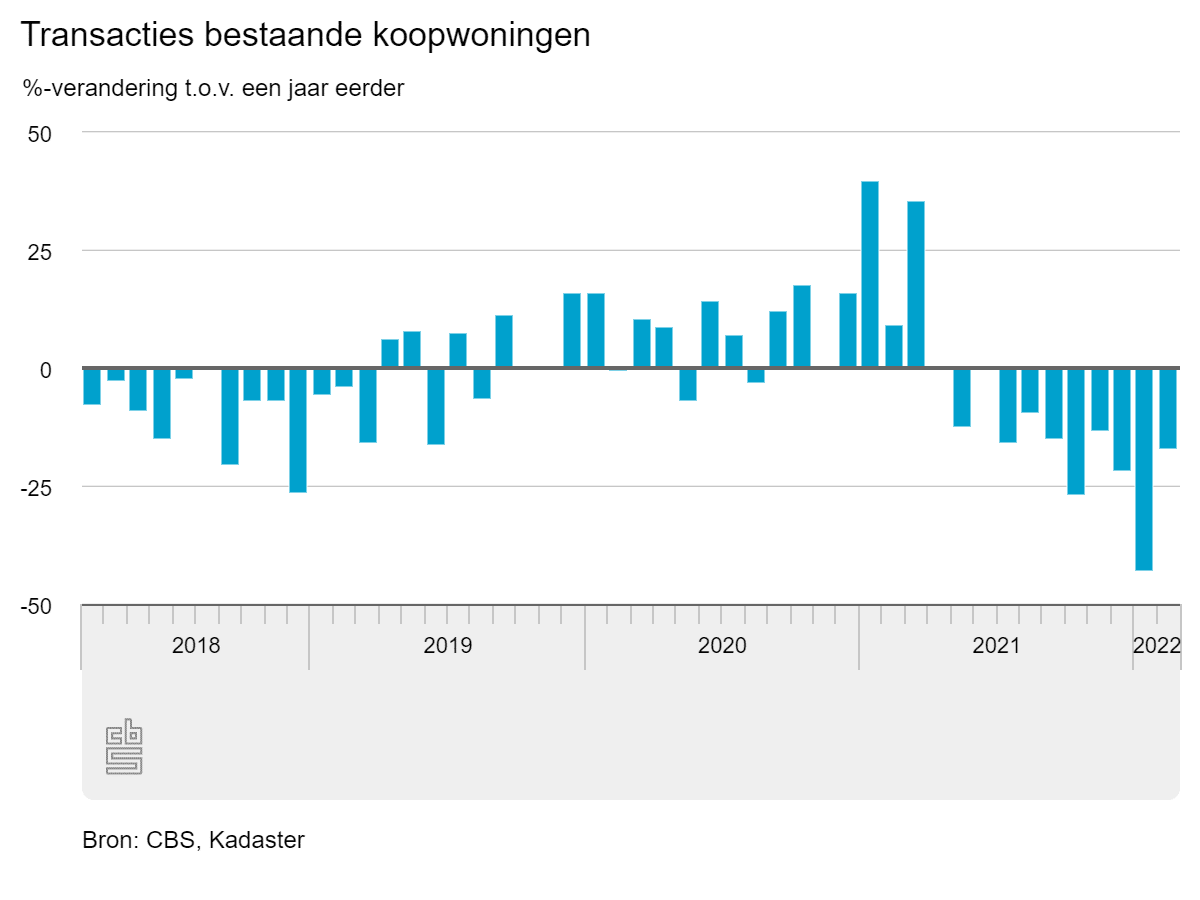 Het Kadaster maakte bekend dat het in februari 14.037 woningtransacties registreerde. Dat is bijna 17 procent minder dan een jaar eerder. In de eerste twee maanden van dit jaar zijn 28.090 woningen verkocht, ruim 32 procent minder dan in dezelfde periode van 2021.