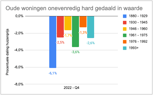 Woningen gebouwd vóór 1930 dalen aanzienlijk harder in waarde dan gemiddeld. Het lage energielabel weegt nu zwaarder dan het vaak karakteristieke uiterlijk van deze huizen.