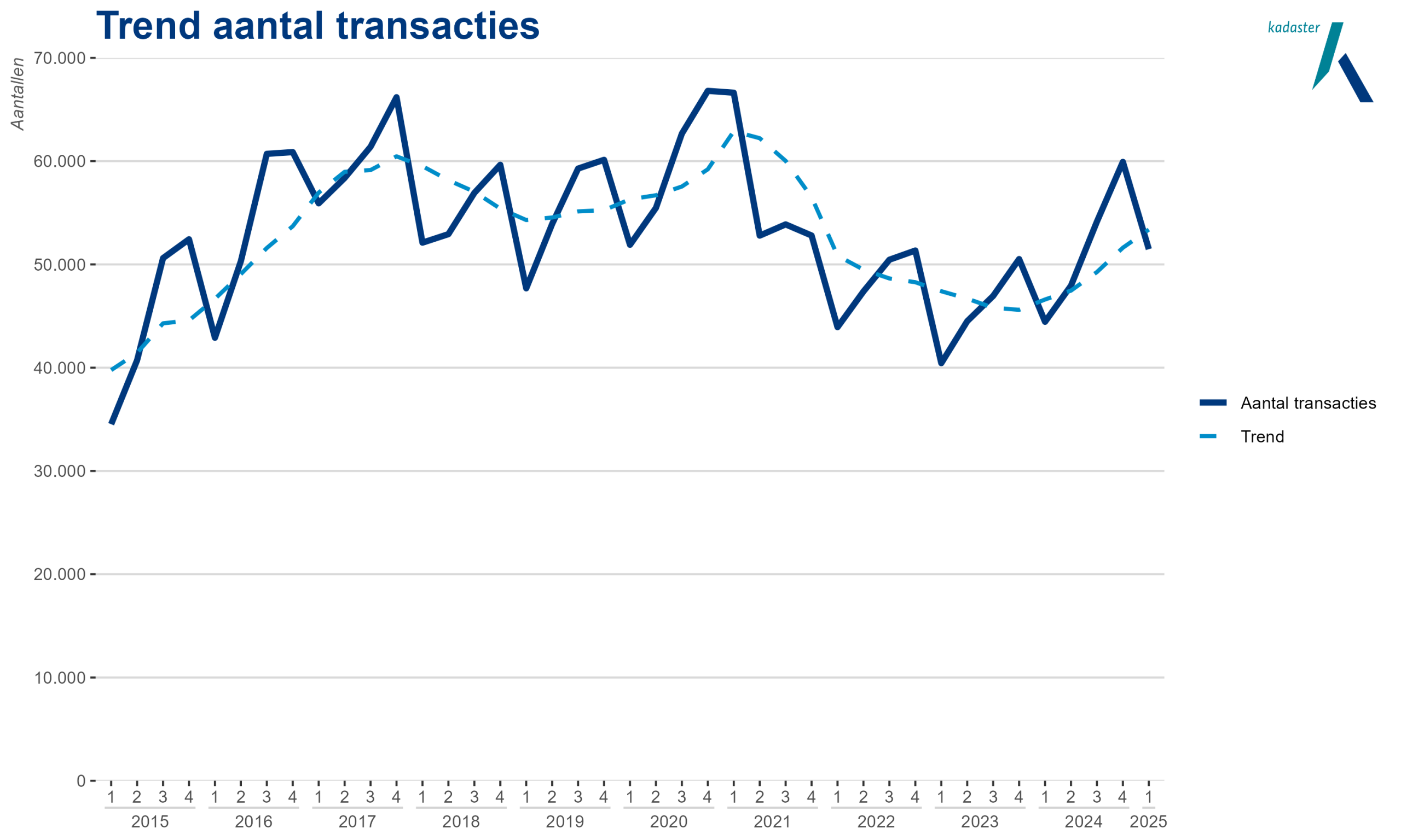 Het Kadaster registreerde in het eerste kwartaal bijna 51.500 woningtransacties. Dat is bijna 16% meer dan in het eerste kwartaal van 2024. Dit is het grootste aantal transacties in het eerste kwartaal sinds de verandering van de overdrachtsbelasting. Die zorgde in het eerste kwartaal van 2021 voor een recordaantal transacties door koopstarters.