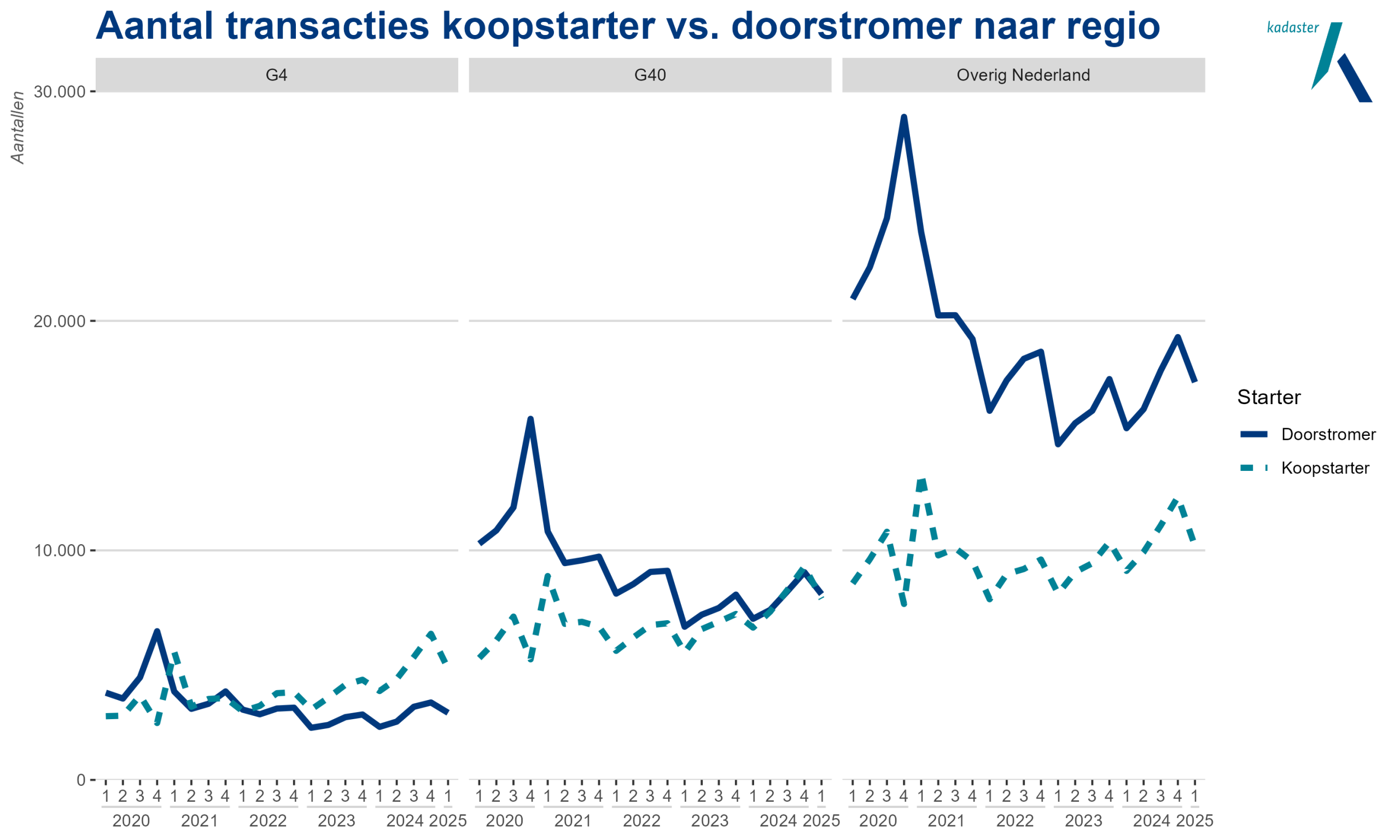Doorstromers kochten bijna 28.500 woningen. Dat is 15% meer dan een jaar eerder. Doorstromers wonnen hiermee een klein beetje marktaandeel terug, stelt het Kadaster. Het aandeel van doorstromers groeide van 53% in het laatste kwartaal van 2024, naar 55%. In vergelijking met de afgelopen jaren was het aandeel van doorstromers nog altijd bijzonder laag. Alleen in de economische crisis meer dan tienb jaar geleden was hun aandeel lager.