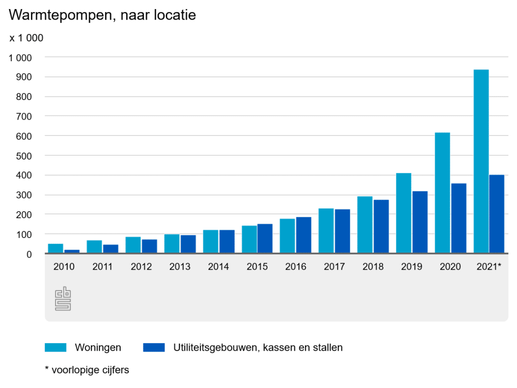 Het aantal warmtepompen in Nederland stijgt sterk. In 2021 zijn er 368.000 nieuwe warmtepompen geïnstalleerd, bijna 50% meer dan een jaar eerder. De meerderheid, 325.000 stuks, kwam bij woningen te staan. Nederland telt nu 1,3 miljoen warmtepompen, waarvan 70% in huishoudens.