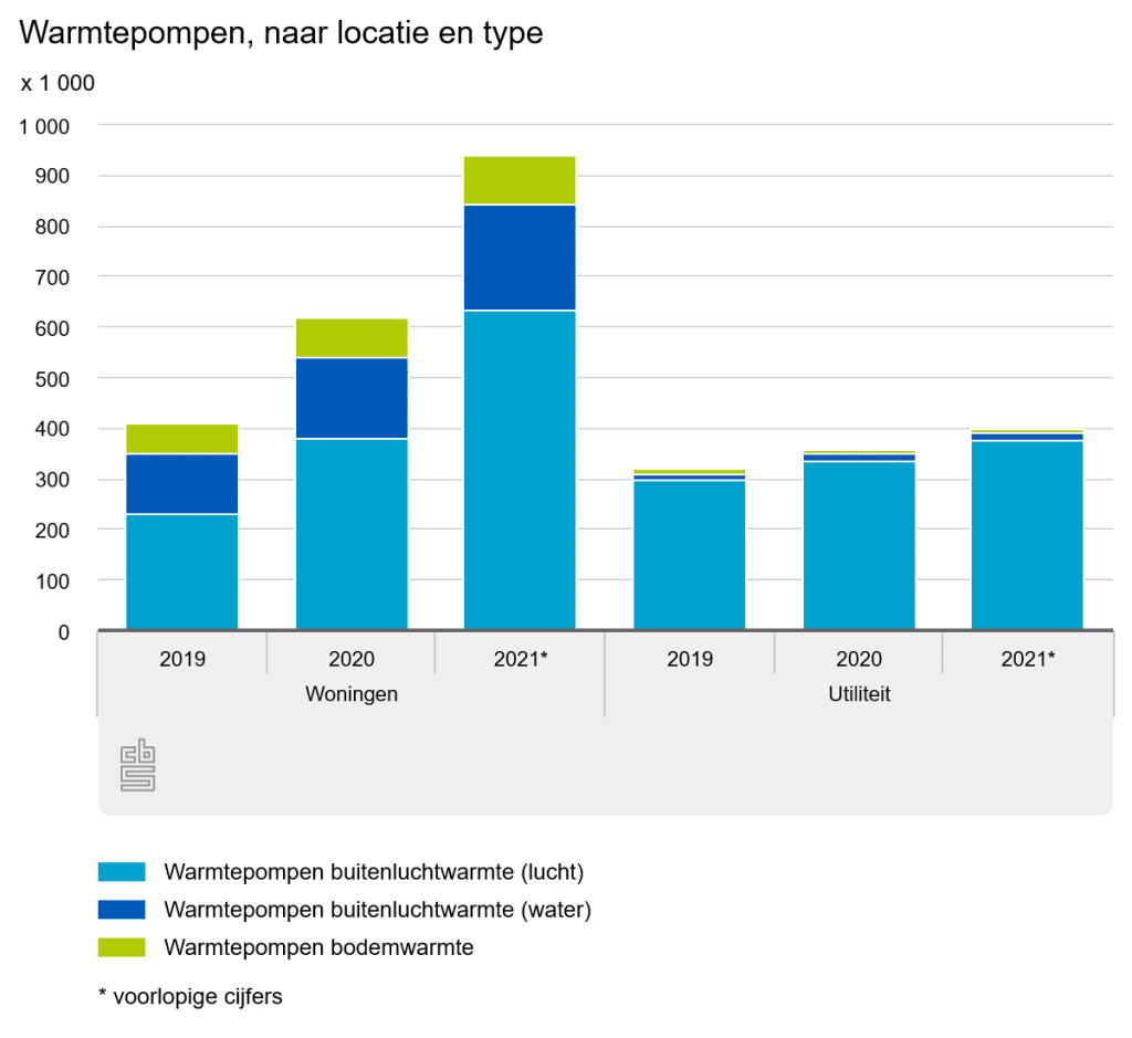 Daarnaast stonden er vorig jaar 206.000 warmtepompen bij woningen die buitenluchtwarmte afgeven aan een verwarmingssysteem op basis van water. Dit is 29% meer dan in 2020. De overige 98.000 warmtepompen bij woningen benutten energie uit de bodem, dit is 25% meer dan een jaar eerder.