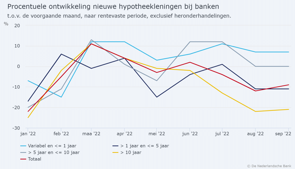 Sinds het begin van dit jaar zijn de hypotheekrentes gestegen van 1 tot 1,5% naar 3 tot 5% nu. Uit de DNB-gegevens blijkt dat in september voor ruim € 1 miljard aan hypotheken is afgesloten met een variabele rente of een rente die maximaal één jaar vaststaat. Dat bedrag is 7% hoger dan in augustus en zelfs 47% hoger dan in januari van dit jaar. Dit terwijl het bedrag van alle hypotheken samen in die periode juist daalde met 16%.