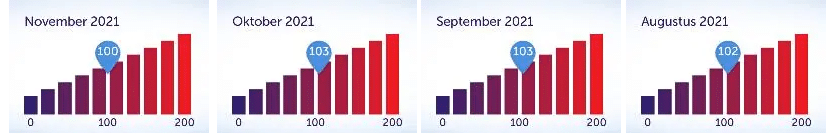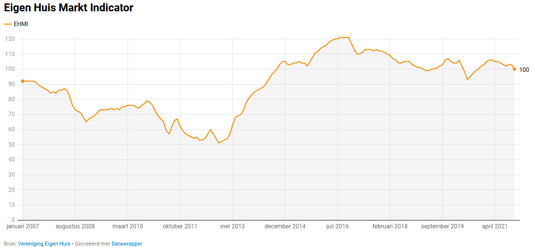 De Eigen Huis Marktindicator geeft het consumentenvertrouwen weer in een bepaald cijfer, waarbij 100 als neutraalwaarde geldt. Het hier weergegeven cijfer betreft een driemaandelijks voortschrijdend gemiddelde.