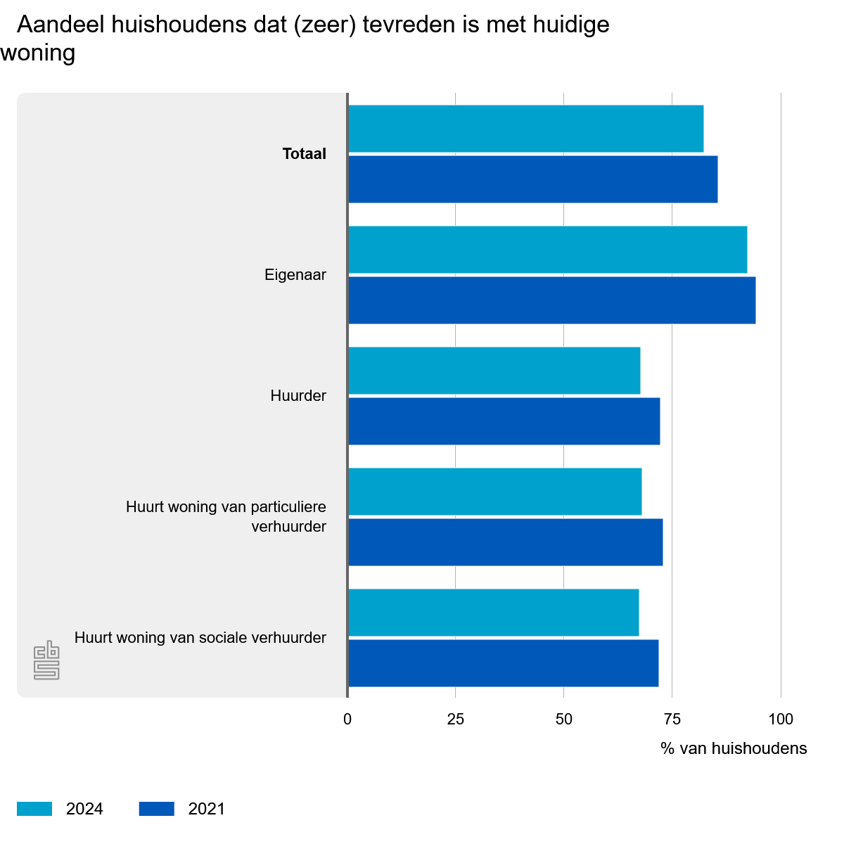 Huishoudens met een koopwoning waren in 2024 vaker tevreden over hun woning dan die met een huurwoning. Dat is minder dan in 2021 (86%). 1 op de 5 klaagt over vocht of schimmel. Verenging Eigen Huis pleit voor gestandaardiseerde energierekeningen.