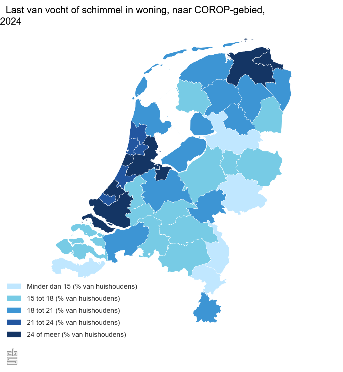 20% van de huishoudens gaf aan last te hebben van vocht en schimmel in de woning. In 2021 was dat nog 15%. Zowel huishoudens met een koopwoning (14%) als met een huurwoning (30%) hadden hier in 2024 vaker mee te maken.